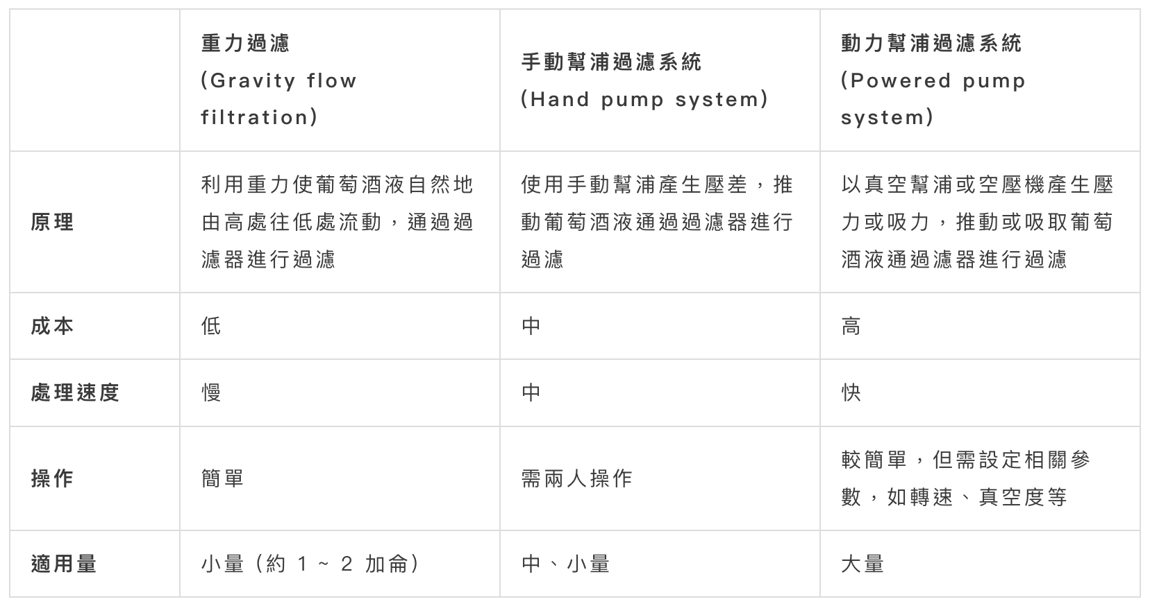 葡萄酒過濾需要搭配濾材 (filtering medium) 進(jìn)行,其依原理主要可分為重力過濾 (Gravity flow filtration)、手動(dòng)幫浦過濾系統(tǒng) (Hand pump system)和動(dòng)力幫浦過濾系統(tǒng) (Powered pump system),操作者可依實(shí)際需求選用合適的方法進(jìn)行葡萄酒過濾。