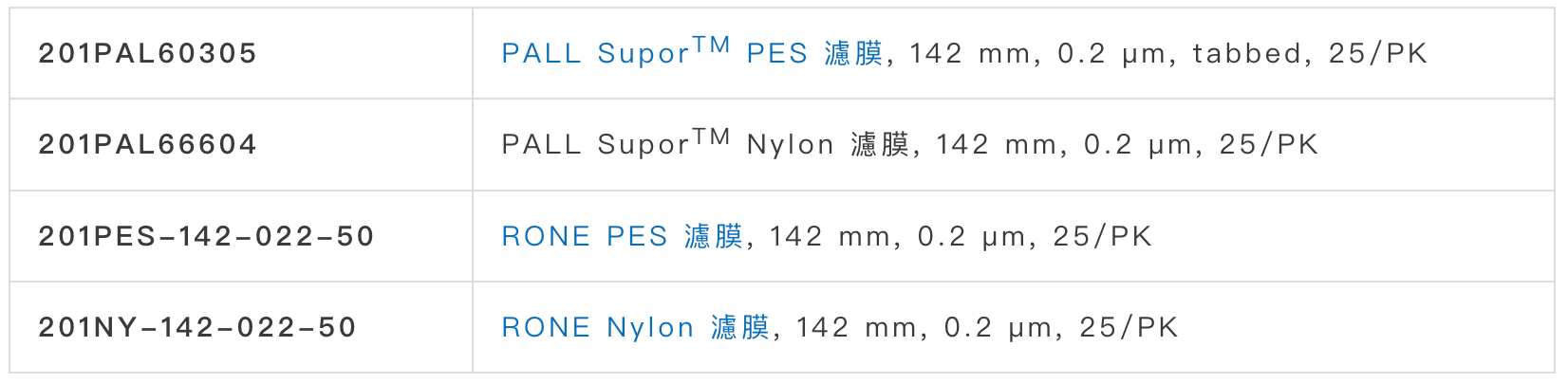 * 以上列表之濾膜皆為標(biāo)稱過濾器 (nominal filter)